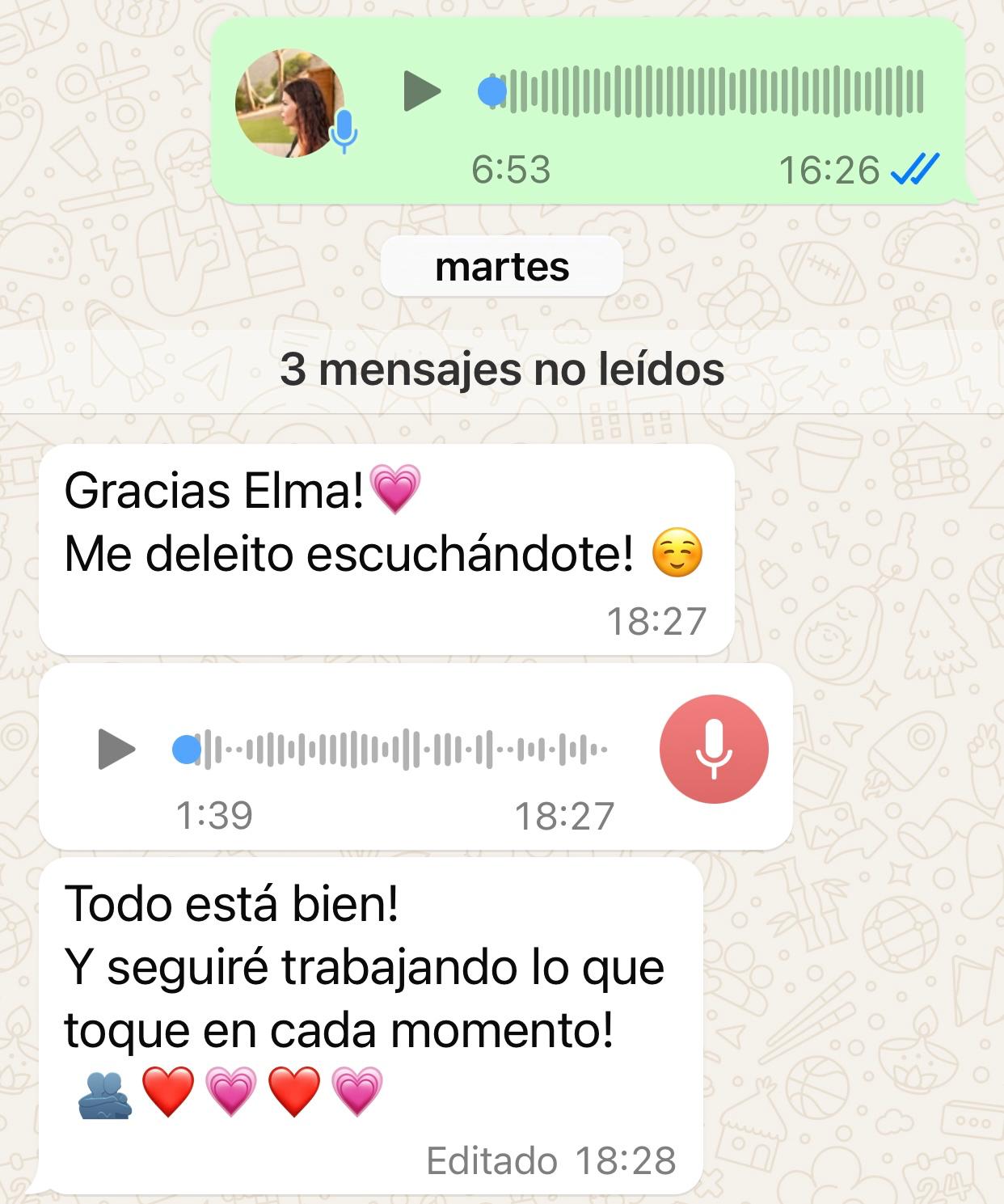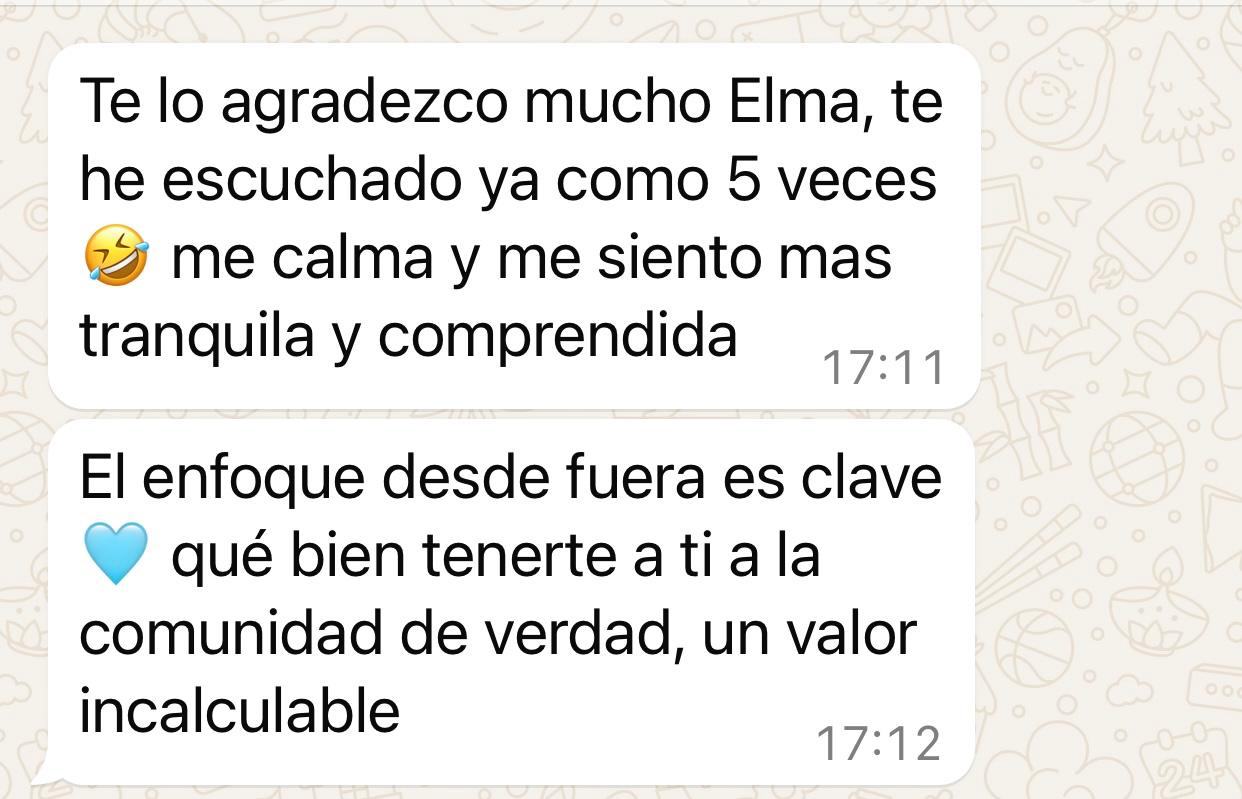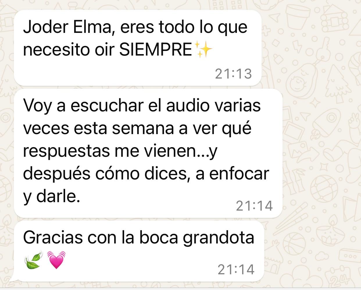 Cada lunes (una vez al mes por persona) podréis contactar con Elma de manera individual vía Whatsapp para hacerle consultas personales.