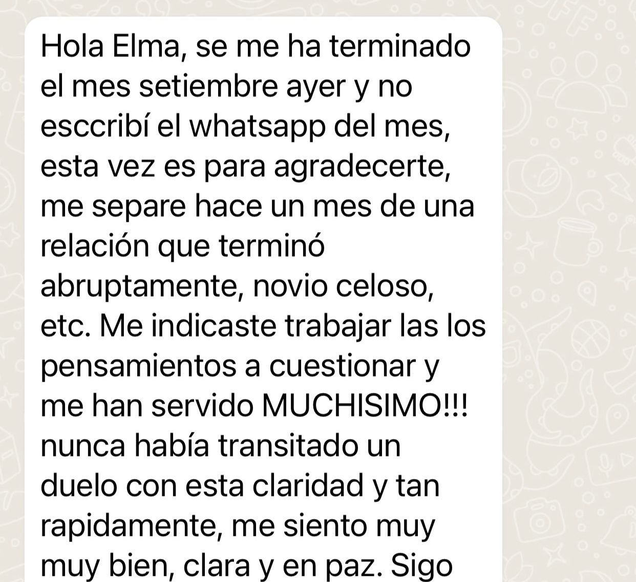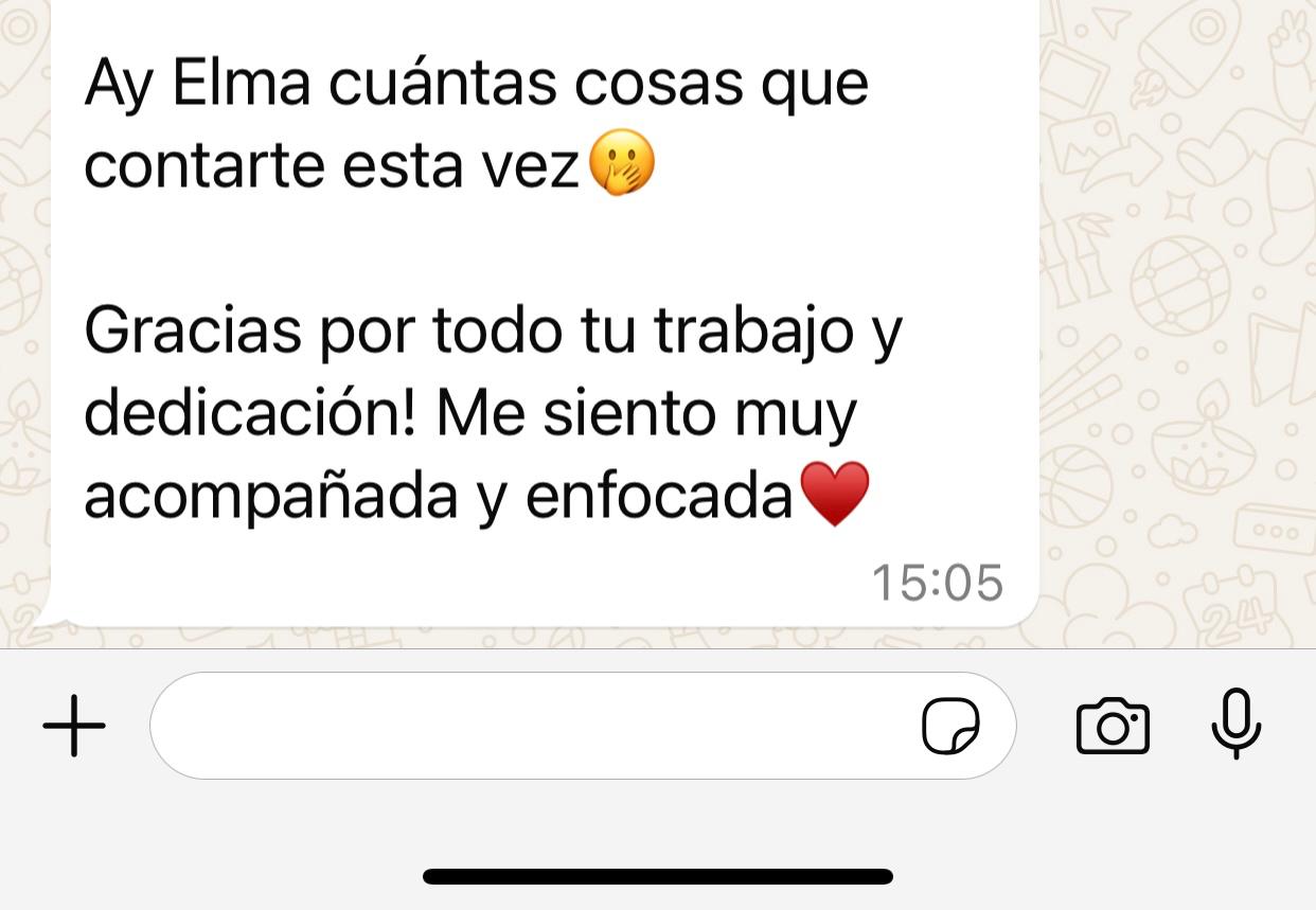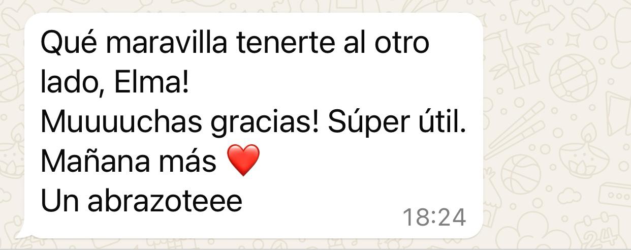 Cada lunes (una vez al mes por persona) podréis contactar con Elma de manera individual vía Whatsapp para hacerle consultas personales.